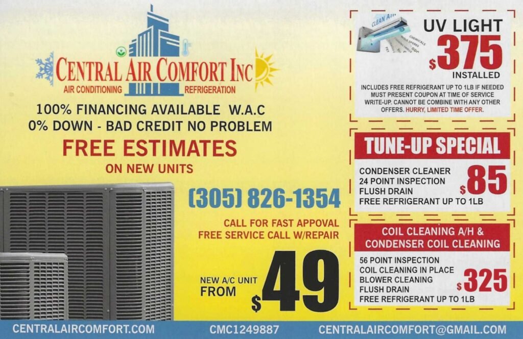 READ MOREEXCELLENT Based on 16 reviews Posted on J PTrustindex verifies that the original source of the review is Google. Quick and efficient service. Very satisfied with the work. Highly recommended.Posted on Juan Carlos OrtegaTrustindex verifies that the original source of the review is Google. Excellent Customer. In less 24 hrs my A/C is working perfect. The technician explain everything.Posted on Consuelo PenaTrustindex verifies that the original source of the review is Google. Amazing service - super knowledgeable - reasonable prices - recommend 💯Posted on Adrian RajkumarTrustindex verifies that the original source of the review is Google. The service was professional, fast and reliable. We really need help in this hot temperature exceeded 100 degrees. Many thanks to Rudy and his team.Posted on Carlos MadanTrustindex verifies that the original source of the review is Google. On time and install went smoothly. Very dependable. Thank you, again.Posted on Joel CastroTrustindex verifies that the original source of the review is Google. Great Service. Prompt Response. Got my A/C up and Running in no time. I couldn't be happier.Posted on Cary Gonzalez-AbreuTrustindex verifies that the original source of the review is Google. Central air comfort is a trustworthy company, they are very experienced and have always come in a timely manner, they have always serviced my home and business and I am very happy with their service, I would definitely recommend them.Posted on Jose RodriguezTrustindex verifies that the original source of the review is Google. Central Air was very professional. They gave me a very good price and a clean job on one of my shopping centers. I was very happy and definitely I will continue doing business with them. Thank youPosted on Barbara MendezTrustindex verifies that the original source of the review is Google. I'm so glad I found this company! I have been using this company for years, for small and big jobs there response is immediately, honest and knowledgeable. The Best AC company!